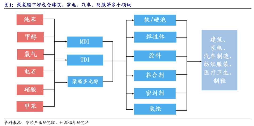 聚氨酯是高分子材料中品种最多、用途最广、发展最快的一种特种有机合成材料,上游主要各类化工原料,中游主要为聚氨酯树脂,包括MDI、TDI、聚醚多元醇和聚酯多元醇,下游为聚氨酯制品,主要包括泡沫体系和CASE体系两个体系。