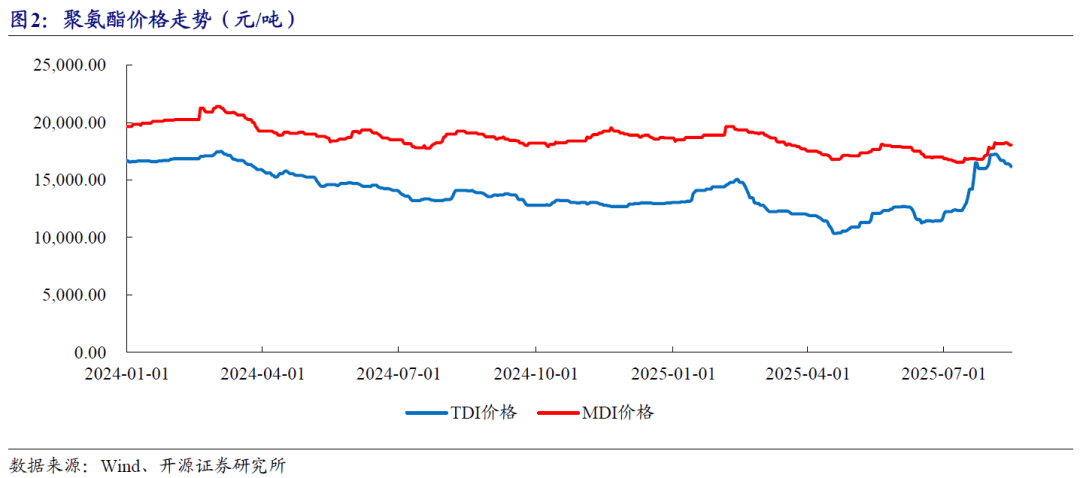 聚氨酯是高分子材料中品种最多、用途最广、发展最快的一种特种有机合成材 料,上游主要各类化工原料,中游主要为聚氨酯树脂,包括MDI、TDI、聚醚多元醇和聚酯多元醇,下游为聚氨酯制品,主要包括泡沫体系和CASE体系两个体系。聚氨酯应用广泛,下游涉及建筑、家电、汽车制造纺织服装、医疗卫生等领域。近期国内聚氨酯价格出现回升迹象,TDI价格相较于2025年6月1日及2025年年初有不同程度的上涨。早在2025年7月,科思创德国TDI装置遭遇不可抗力,海外TDI市场供应受限,除此之外,受能源成本和环保政策影响,海外TDI产能持续收缩,部分大厂产能退出市场竞争。我们认为受益于海外供给收缩,行业供需格局将得到优化,聚氨酯行业景气有望上行。建议关注北交所一诺威。