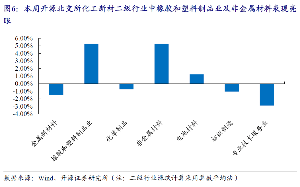 本周开源北交所化工新材二级行业中橡胶和塑料制品业及非金属材料表现亮眼,周涨跌幅分别为+5.27%、+5.26%;其余行业周涨跌幅分别为:电池材料(+1.22%)、化学制品(-0.74%)、纺织制造(-1.05%)、金属新材料(-1.46%)、专业技术服务业(-2.90%)。